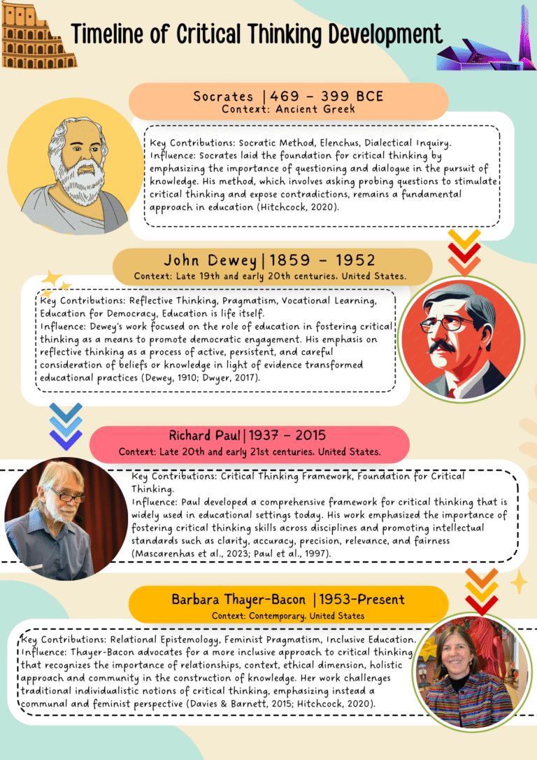 Critical thinking is widely regarded as a cornerstone of education, essential for problem-solving, decision-making, and meaningful engagement with the world. The development of this skill has been significantly shaped by several key thinkers, each contributing distinct ideas that have influenced contemporary educational theory and practice. This essay will explore the contributions of four pivotal figures in critical thinking: Socrates, John Dewey, Richard Paul, and Barbara Thayer-Bacon. It will begin by examining the foundational ideas introduced by each thinker, followed by an analysis of how these ideas have evolved over time. An infographic timeline will illustrate the key contributions and influence of each thinker in the development of critical thinking theory. By placing their contributions within their historical contexts, the essay aims to highlight the enduring relevance of these insights and their impact on modern educational practices. This comprehensive analysis will provide a deeper understanding of how these diverse perspectives continue to shape and enhance critical thinking in education today.
